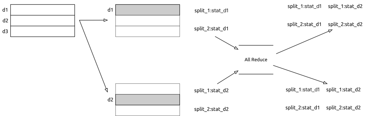 常用分布式训练方式,应该是参数服务器。worker把sample的统计结果推送到单台参数服务器机器上,参数服务器汇总后,再推送到worker端。有点类似于单reducer的方式。